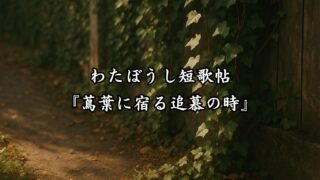 わたぼうし短歌帖 わたぼうし短歌帖『蔦葉に宿る追慕の時』 わたぼうし短歌帖『蔦葉に宿る追慕の時』。夜の静けさに寄り添いながら、季節の記憶と心の風景を五行のうたに綴っています。 2025.09.19 わたぼうし短歌帖