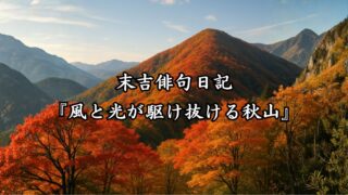 末吉俳句日記 末吉俳句日記『風と光が駆け抜ける秋山』 末吉俳句日記『風と光が駆け抜ける秋山』の情景を言葉にのせてお届けします。季節のひとときを、静かな一句にそっと託して綴っています。 2025.10.17 末吉俳句日記
