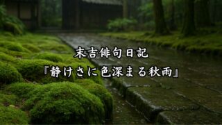 末吉俳句日記 末吉俳句日記『静けさに色深まる秋雨』 末吉俳句日記『静けさに色深まる秋雨』の情景を言葉にのせてお届けします。季節のひとときを、静かな一句にそっと託して綴っています。 2025.10.18 末吉俳句日記