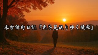 末吉俳句日記 末吉俳句日記『光を見送りゆく晩秋』 末吉俳句日記『光を見送りゆく晩秋』の情景を言葉にのせてお届けします。季節のひとときを、静かな一句にそっと託して綴っています。 2025.10.24 末吉俳句日記
