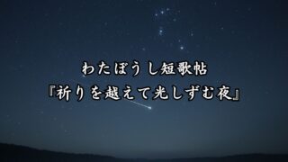 わたぼうし短歌帖 わたぼうし短歌帖『祈りを越えて光しずむ夜』 わたぼうし短歌帖『祈りを越えて光しずむ夜』。夜の静けさに寄り添いながら、季節の記憶と心の風景を五行のうたに綴っています。 2025.10.23 わたぼうし短歌帖