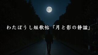 わたぼうし短歌帖 わたぼうし短歌帖『月と影の静謐』 わたぼうし短歌帖『月と影の静謐』。夜の静けさに寄り添いながら、季節の記憶と心の風景を五行のうたに綴っています。 2025.11.05 わたぼうし短歌帖