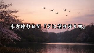 末吉俳句日記 末吉俳句日記『夕に消ゆ帰り鴨』 末吉俳句日記『夕に消ゆ帰り鴨』の情景を言葉にのせてお届けします。季節のひとときを、静かな一句にそっと託して綴っています。 2026.03.25 末吉俳句日記末吉俳句日記十二月の句
