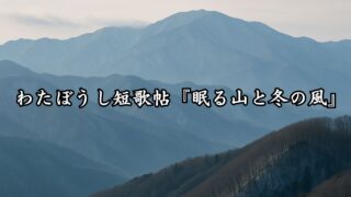 わたぼうし短歌帖 わたぼうし短歌帖『眠る山と冬の風』 わたぼうし短歌帖『眠る山と冬の風』。夜の静けさに寄り添いながら、季節の記憶と心の風景を五行のうたに綴っています。 2025.12.12 わたぼうし短歌帖